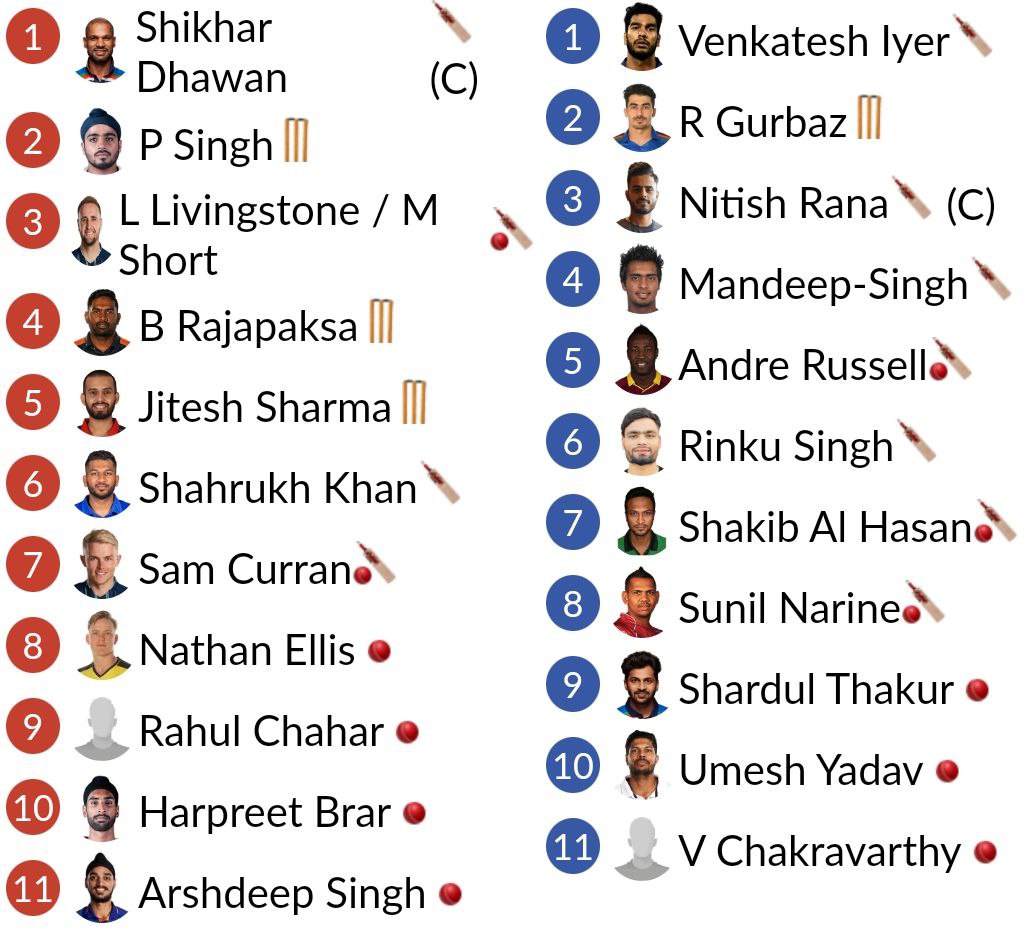 - शिखर धवन ने अपने पूरे आईपीएल करियर में 6244 रन बनाए हैं और कोलकाता नाइट राइडर्स के खिलाफ पंजाब किंग्स के लिए सबसे ज्यादा रन बनाने वाले बल्लेबाज के लिए हमारा चयन है। गेंद के साथ, अर्शदीप सिंह एक पारी की शुरुआत और अंत में विकेट लेने का खतरा है। वह इस मैच में पंजाब किंग्स के शीर्ष विकेट लेने वाले खिलाड़ी के रूप में समर्थन के लायक हैं।